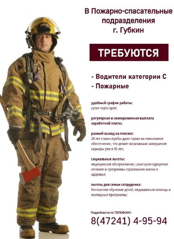 В пожарно-спасательные подразделения г. Губкин требуются водители категории С, пожарные. График работы сутки через трое. Регулярная и своевременная выплата заработной платы. Ранний выход на пенсию: 20 лет стажа службы дают право на пенсионное обеспечние, что делает возможным завершение карьеры уже в 45 лет. Социальные льготы: медицинское обслуживание, санаторно-курортное лечение и программы страхования жизни и здоровья. Льготы для семьи сотрудника: бесплатное обучение детей, медицинская помощь и жилищные программы.